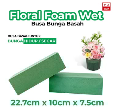 Floral foam wet bertekstur lebih lunak, mudah menyerap serta menahan air, dan digunakan untuk mempertahankan kesegaran bunga segar, sedangkan floral foam dry bertekstur lebih keras, tidak menyerap air, dan berfungsi sebagai penopang rangkaian bunga artificial atau bunga kering agar tetap stabil dalam posisi yang diinginkan.